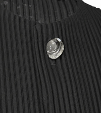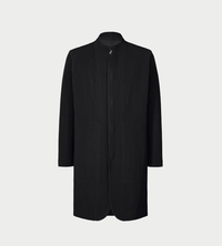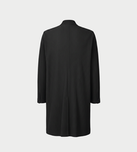 This collarless long jacket has a smart silhouette. It is characterized by its portability with the unique quick-drying property of polyester material. It has thin padding on the shoulders and can be worn in a wide range of situations, from formal to casual. The top button is a special glass button reminiscent of Italian glasswork, and a standard plastic button is included as a spare. There are pockets on both sides and inside, and a center vent at the back.