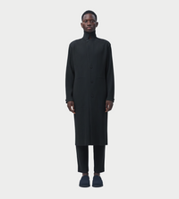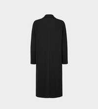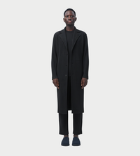 This tailored, long pleated jacket in black has notched lapels with an added button at the neckline, a three-button closure, two side and two inner pockets. It is partially lined.
