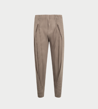 These pants with center tucks feature a simple design. They are characterized by their portability and the unique quick-drying properties of the polyester material. They pair well with jackets and can be used in a wide range of occasions, from formal to casual. They have pockets on both sides and belt loops at the waist. They have a button-fly design.