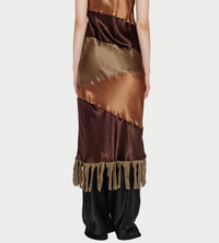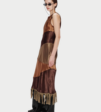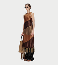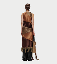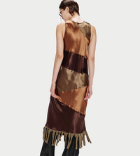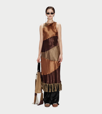 Tank dress in a sheened satin drape. Featuring a high neckline, straight line fit and fringed hem details.