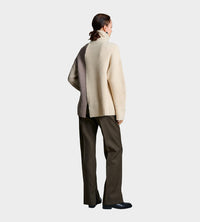Chunky ribbed wool turtle neck with made with soft brushed wool, with diagonal flat knit taupe panel. This sweater has a slight oversized fit, with a drop shoulder.