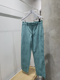 Pressed cotton corduroy-blend pants in teal with a velvet finish, mid-rise waist, and straight-legs.