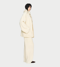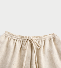Crafted from textured wool with subtle fringed detailing, these pants feature a loose-fitting straight-leg silhouette and an adjustable drawstring waist. The ivory tone enhances their soft drape, offering relaxed comfort with refined simplicity.
