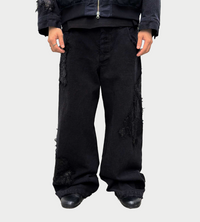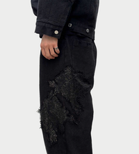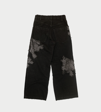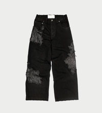 Introduced in 21.2 Beast, the Wide Leg Pant is a foundational Song for the Mute silhouette, balancing sharp formality with fluid ease through a structured tailored waistband and a full length wide leg. Cut from the same washed cotton denim as the Hooded Denim Jacket, the pant is constructed in an over dyed finish that softens with wear, balancing structure with fluid drape. It features four pocket styling, contrast stitching, logo engraved metal hardware and back welt pockets. Hand appliquéd lace and sequins trace sections of the leg, introducing texture, irregularity and a quiet sense of imperfection. Fits true to size — take your normal size.