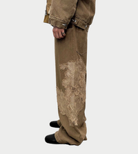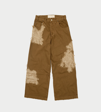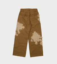 Introduced in 21.2 Beast, the Wide Leg Pant is a foundational Song for the Mute silhouette, balancing sharp formality with fluid ease through a structured tailored waistband and a full length wide leg. Cut from the same washed cotton denim as the Hooded Denim Jacket, the pant is constructed in an over dyed finish that softens with wear, balancing structure with fluid drape. It features four pocket styling, contrast stitching, logo engraved metal hardware and back welt pockets. Hand appliquéd lace and sequins trace sections of the leg, introducing texture, irregularity and a quiet sense of imperfection. Fits true to size — take your normal size.
