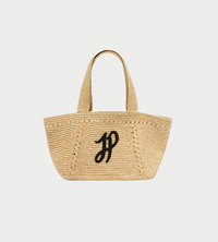 Vanilla natural raffia tote. Small version. Trapeze shape. Two shoulder straps. Contrast JP monogram embroidery at the front.
