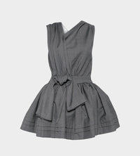 Tuck-edge sloping neckline mini dress in classic grey color. Polyester- and wool-blended, pleats and gathering throughout. Modified Y-neck, knotted accent at front, tiered hem, and concealed zip closure at back