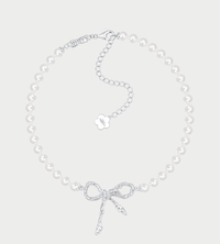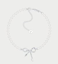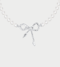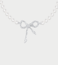 A strand of luminous pearls anchored by a sculpted silver ribbon. The bow form is rendered with delicate texture, introducing subtle movement and contrast against the smooth surface of the pearls.