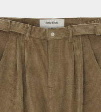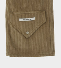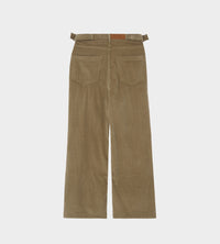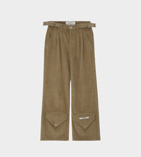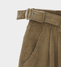Slight stretch corduroy wide leg pants. Features high waist, 2 pockets decoration at the bottom part, zip and button fly. Adjustable waist belts on the side of the pant.
