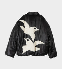 Fully lined oversized cropped puffer jacket in a fluid poly. Featuring a piped hemline and cuffs with seasonal "Bird" motif paneling at back. Wadded with duck down and feathers.