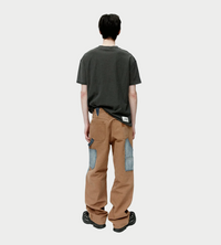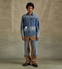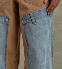 Full length, straight leg carpenter jean in brown and blue color. Stone washed cotton fabric. Double waistband remake design. Andersson Bell engraved detail.