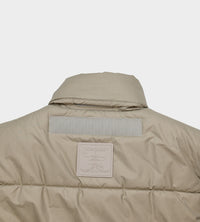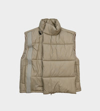 Beige padded and quilted polyester-blend taffeta vest. Stand collar, two-way zip closure with velcro placket, detachable velcro panel at front for alternate styling. Bungee-style drawstring at hem. Welt pocket at interior.
