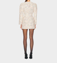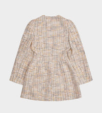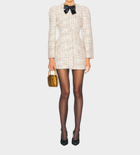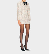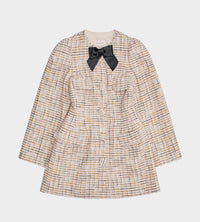 Pink tweed fabric waist-Cinched Round Collar Jacket. Front button closure; puffy-sleeve design; removable satin bow accent at collar; four-faux flap pocket design.