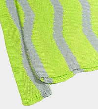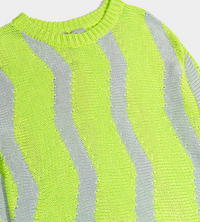 Horizontal knit, lime green crewneck sweater with light grey "waves". This chunky knit sweater features a slim sleeve and a slightly dropped shoulder line.