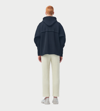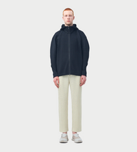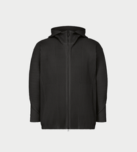 This black two-way zip pleated hoodie has long sleeves and side pockets.