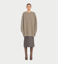The entire piece is made from soft, substantial knit fabric, where wide vertical ribbing adds exceptional depth to the texture. The low, slightly raised collar harmoniously complements the rest of the sweater, while the unique back detail—a vertical pleat with a subtle slit—offers a sophisticated construction element, reflecting the designer’s innovative approach.