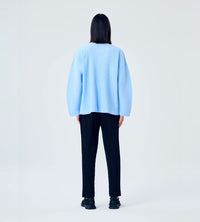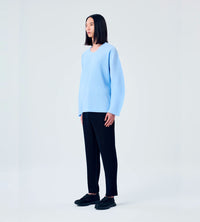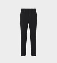 Heavy gauge, basic pleated slim leg pants with elastic waistband and button fly. This pant had a texture that resembles wool.