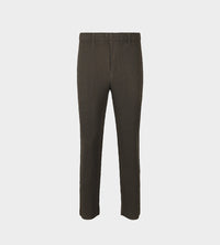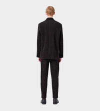 Heavy gauge, basic pleated slim leg pants with elastic waistband and button fly. This pant had a texture that resembles wool.