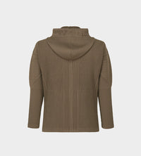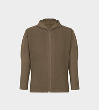 Pleated zip front, funnel neck jacket with 2 hidden pockets at waist. Jacket is half lined, and has tonal hardware.
